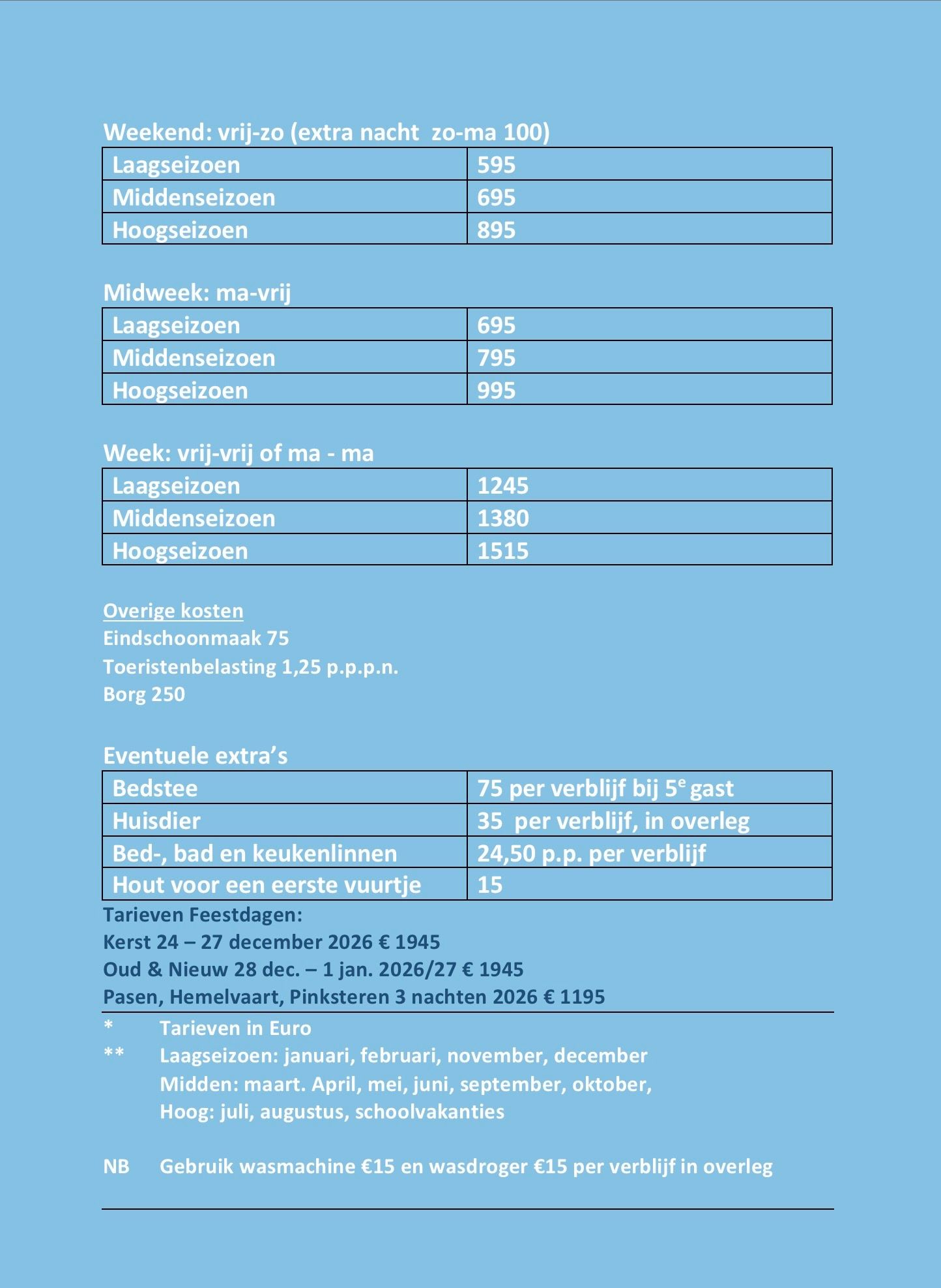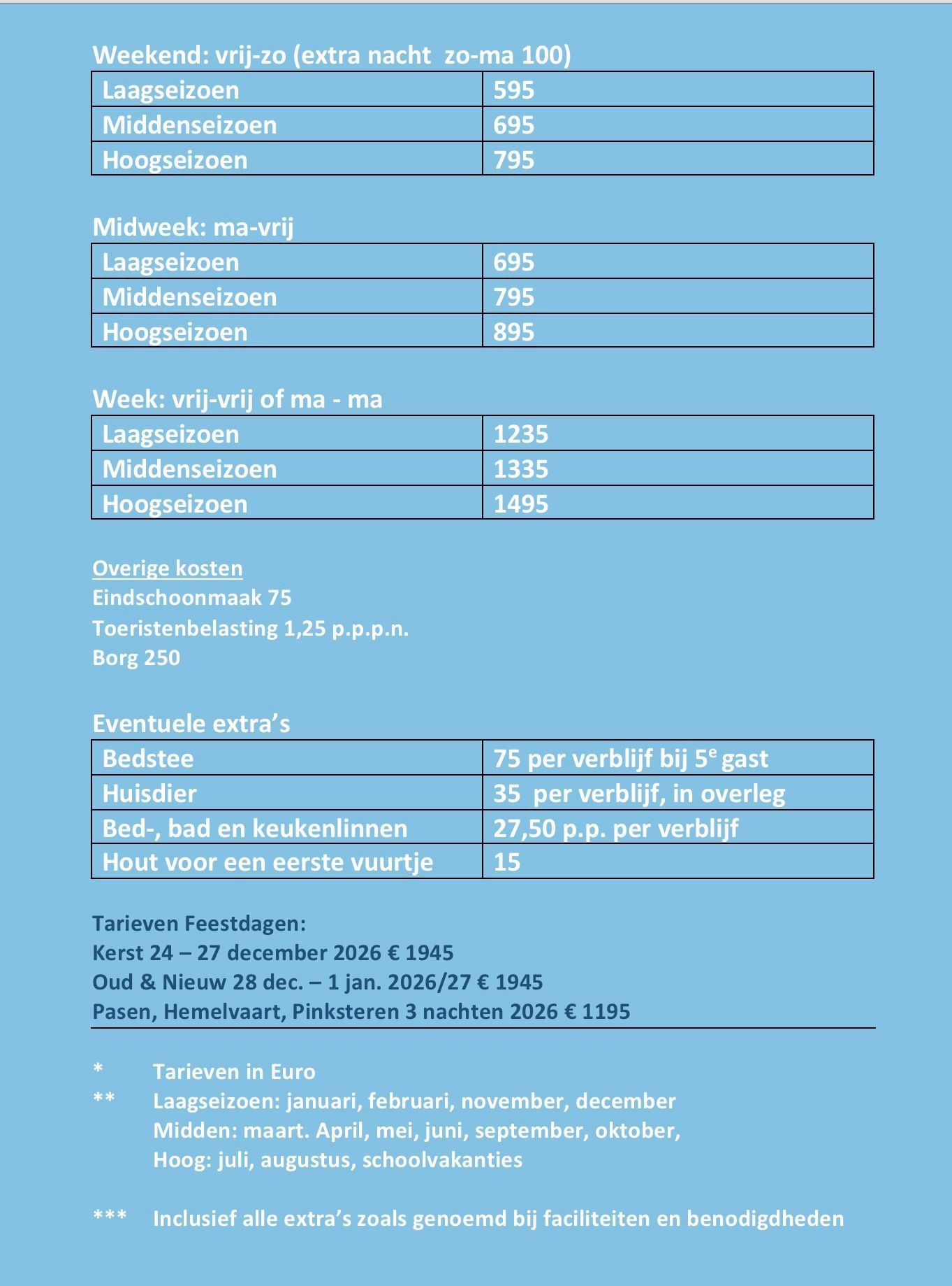 Tarieven staan onder de kalender. Een reservering aanvragen kan via ons contactformulier. De kalender is actueel en wordt na iedere reservering bijgewerkt.
